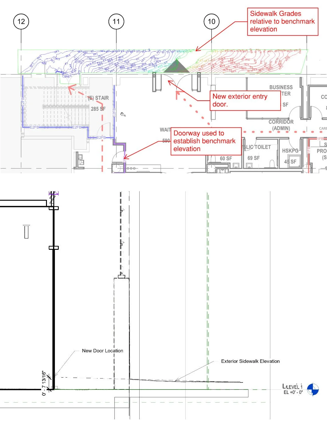 Because the project required the addition of a new exterior door, the team needed accurate information about the grade difference between the interior floor and the exterior sidewalk.